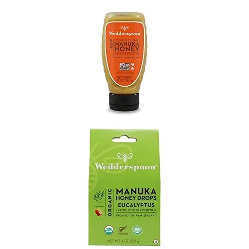 Wedderspoon Raw Premium Manuka Honey KFactor 16 botellas exprimibles (12 onzas) y gotas de miel de manuka, eucalipto y propóleo de abeja (4 onzas)