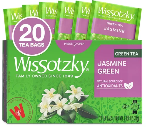 Mezcla de té perfumado: el té verde de jazmín Wissotzky es una mezcla clásica que ofrece una experiencia floral fragante y delicada. Nuestras bolsas de té de jazmín están cargadas de antioxidantes, incluyendo EGCG, que pueden ayudar a aumentar el metabolismo y proporcionar una sensación de calma. El té verde Wissotzky con jazmín está certificado Kosher para uso durante todo el año, incluida la Pascua. Rico en antioxidantes: el té rico en antioxidantes ofrece una potente mezcla de beneficios para la salud, y disfruta regularmente de té rico en antioxidantes naturales, como las bolsas de té verde Wissotzky que proporciona un enfoque integral de la vitalidad general. Empaquetadas con cuidado: nuestras bolsas de té están cuidadosamente elaboradas sin grapas, lo que permite calentar microondas sin esfuerzo y no hay necesidad de preocuparse por el metal en tu bebida. Cada bolsa también está envuelta en una bolsa de aluminio para preservar la calidad del sabor, la frescura y el aroma. Té verde: nuestro té verde premium promueve naturalmente la relajación y ayuda a reducir los niveles de estrés, proporcionando un escape relajante de las demandas de la vida diaria. También es conocido por sus propiedades inmunitarias, ayudando a su cuerpo a defenderse de amenazas externas y promover el bienestar general. Nuestra historia: el té Wissotzky de confianza desde 1849, tiene calidad que puedes probar. Durante cinco generaciones hemos estado eligiendo tés, mezclándolos, ahuecándolos y mezclándolos nuevamente hasta que sean tés que realmente puedas amar. Nuestro compromiso inquebrantable con la calidad y el sabor garantiza que la taza de cada cliente tenga un sabor notable.