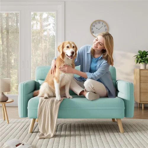 Especificaciones: Materiales: Tela de poliéster, madera de caucho, espuma, madera maciza, madera contrachapada, hierro, relleno de fibra de poliéster; Color: aguamarina; Dimensiones generales: 46 ″ W × 29 ″ D × 30.5 ″ H; Capacidad máxima de peso: 348 lb Asiento Profundo y Cómodo: El asiento de 38 pulgadas (ancho) y 20 pulgadas (profundidad) puede acomodar tus diferentes posturas de sentado (enroscadas/con las piernas cruzadas, sentado con las piernas extendidas, etc.) Sin ocupar valioso espacio en el suelo. El asiento acolchado puede acomodar a 2 invitados de tamaño mediano o proporcionar un lugar acogedor para que usted y sus mascotas se sienten juntos. Patas de madera separadas: Cuatro patas de caucho de madera separadas con un acabado de veta de madera aportan solidez mientras añaden un toque moderno de mediados de siglo a tu hogar u oficina. Las almohadillas adjuntas evitan arañazos en el suelo. Fácil de instalar: requiere montaje sencillo. En menos de 30 minutos, puedes tener tu nuevo sofá de dormitorio listo siguiendo las instrucciones de instalación detalladas y utilizando todas las herramientas necesarias. La limpieza es muy sencilla: las fundas de almohadas lumbares extraíbles hacen que el lavado a máquina sea fácil, y la altura libre de 21.5cm/8.5'' debajo permite que las aspiradoras robot se deslicen y limpien debajo del sofá, lo que hace que el mantenimiento diario sea simple para usted.