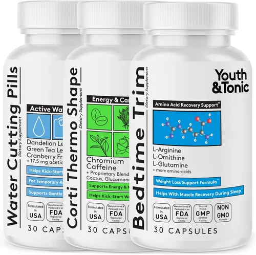 Esculpe Lean Defined & Feel Energized: Este sistema 3 en 1 combina el peso del agua, la forma de cortithermo y el ajuste a la hora de acostarse para ayudar a impulsar su viaje de bienestar. Diseñado para aquellos que buscan un cuerpo más ligero, más energizado y más delgado, este programa complementa su dieta saludable, movimiento constante y rutina de hidratación. Peso del agua – Aspecto magro y apoyo de desintoxicación: Estas píldoras de agua cuentan con una mezcla de ingredientes de píldoras de agua diuréticas como diente de león, té verde y vitamina B6, que se utilizan para ayudar al cuerpo a controlar la retención ocasional de agua. Apoya una apariencia más definida al abordar la hinchazón y complementa tu rutina de desintoxicación. También funciona como píldoras de retención de agua Recorte a la hora de acostarse – Esculpir y recuperarse durante la noche: Formulada con aminoácidos esenciales como L-glutamina, L-lisina y arginina, esta mezcla nocturna apoya la recuperación muscular y los objetivos corporales magros durante el descanso. Diseñado para personas activas, complementa la reparación durante la noche, ayudándote a despertar sintiéndote renovado y listo para mantenerte en el camino Forma de cortithermo: energía, metabolismo y disciplina dietética: Esta fórmula dietética apoya la energía limpia y el enfoque mental con cafeína y guaraná, mientras que el cromo, el glucomanano y la hoodia gordonii ayudan a mantener la disciplina dietética para una alimentación consciente. También apoya el metabolismo saludable, por lo que es una gran adición a tu estilo de vida activo y rutina de bienestar Cómo usar y estándares de calidad: Tome 1-2 cápsulas de píldoras de corte de agua y Cortithermo Shape diariamente con las comidas. Para Cortithermo, el uso matutino y temprano en la tarde es ideal. Tome 1 cápsula Bedtime Trim por la noche con el estómago vacío con agua. Para un apoyo óptimo, mantenga la hidratación y una rutina equilibrada. Fabricado en los Estados Unidos en una instalación certificada por GMP y probado por terceros para su calidad