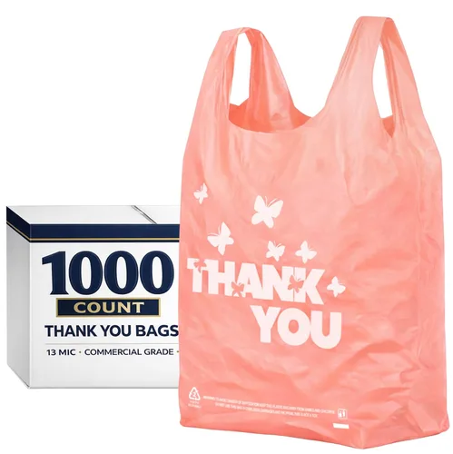 Resistente y duradero: hechas de material HDPE de alta calidad, estas bolsas rosas para camisetas con texto en inglés "Thank You" son fuertes, resistentes a desgarros y confiables para el uso diario en pequeñas empresas o servicios para llevar. Gran capacidad: el tamaño grande de 11 x 6 x 21 pulgadas se adapta fácilmente a cajas para llevar, comestibles o artículos al por menor, mientras que las cómodas asas hacen que el transporte sea conveniente. Diseño llamativo – El vibrante color rosa con el texto audaz "Thank You" añade un toque profesional y amigable a tu embalaje para clientes. Uso versátil: ideal para restaurantes, boutiques, tiendas de conveniencia y mucho más. Ideal para comida para llevar, alimentos, pago en tiendas minoristas o necesidades de almacenamiento diario.
