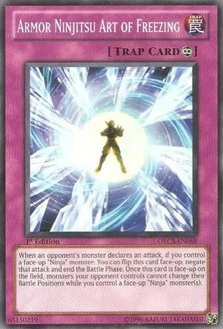 Yu-Gi-Oh! es un juego estratégico de cartas intercambiables en dos jugadores en duelo usando una variedad de cartas de monstruo, hechizo y trampa para derrotar a los monstruos de su oponente y ser el primero en dejar caer los puntos de vida del otro a 0. Nombre de la tarjeta: Armor Ninjitsu Art of Freezing Tipo de tarjeta: Trampa continua Número de tarjeta: ORCS-EN068 Conjunto: Orden del Caos Atributo : Trap Código de acceso: 65150219 Texto de la carta: Cuando un oponente'smonsterdeclaresanattack, si controlaface-up monstruo "Ninja": Puedes voltear esta cartaface-upnegatethatackand terminar la fase de batalla. Una vez que esta carta esté boca arriba en el campo, los monstruos que controla tu oponente no pueden cambiar su posición de batalla, mientras controlas un monstruo "Ninja" boca arriba.