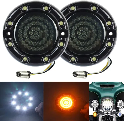 Señal de giro LED frontal y luz de funcionamiento: las señales de giro delanteras cuentan con LED estilo bala que se iluminan para luz de marcha y señal de giro. Durante la señal de giro, cambiarán de color y el LED interior se iluminará en ámbar, anillo exterior iluminado. Esto permite más luz para la señal de giro y te permite ser más notable. Para la luz de funcionamiento, el anillo exterior es blanco para la luz corriente y el LED exterior se apaga. Solo enchufa y juega: su plug and play, no necesita piezas adicionales. La instalación es extremadamente simple: saca la lente vieja, inserta la nueva luz, vuelve a colocar la lente y ve a dar un paseo que solo toma minutos. Más fiables y de mejor aspecto que las bombillas originales originales. Compatibilidad: compatible con motocicleta Harley con señales de giro de estilo plano de 3 1/4 pulgadas y enchufe 1157. Reemplazo Plug and Play. No requiere cableado. Plug and play en los modelos Electra Glide 1986-2013, modelos Road King 1986-2018, Heritage Softail 1986-2017, Road Glide 1999-2003 y Road Glide Classic 2005 Modelo estadounidense Harley-Davidsons. El paquete incluye: 2 piezas de caja negra de 3 1/4 pulgadas 1157 LED de señal de giro y luces de funcionamiento (no necesita lente de señal de giro adicional) INSTALACIÓN: Conexión de 3 cables (se puede necesitar resistencia de carga, no incluida en el paquete): Negro para negativo, blanco para DRL positivo y amarillo para señal de giro positivo